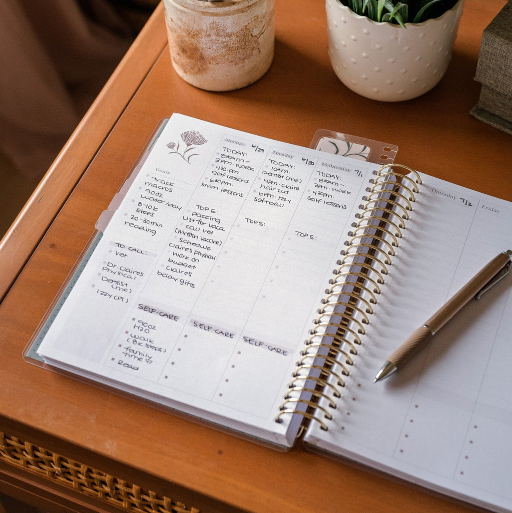 Each weekly spread gives you generous space to map out your schedule, priorities, and to-do lists, all in a layout that flows naturally from top to bottom. You’ll also find an entire page each week for meals and workouts, along with space for goal setting, notes, and a simple health accountability tracker to help you stay consistent.